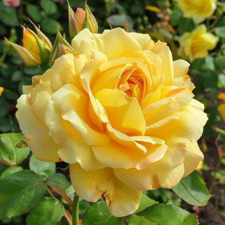 Soi clasic de trandafir hibrid de ceai cu flori galbene aprinse, parfumate, care pot deveni ușor crem în condiții de soare puternic. Florile sunt de mărime medie, cu numeroase petale, grupate în inflorescențe dense. Planta este robustă, cu tulpini verticale și formă compactă (60–80 cm), potrivită pentru grădini și pentru tăiere în buchete. Înflorește abundent pe tot parcursul verii, la expunere solară și sol bine drenat.
